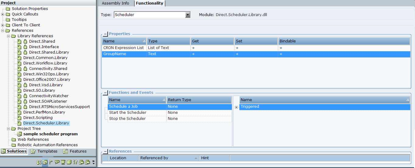 The functions are exposed under Project > References > Library References > Direct.Scheduler.Library.