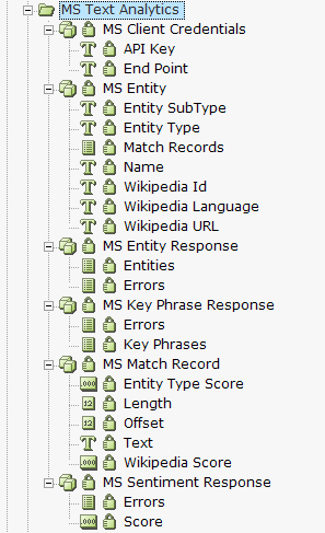 The business entities of Microsoft Text Analytics are exposed under Business Entities > Library Types > MS Text Analytics.