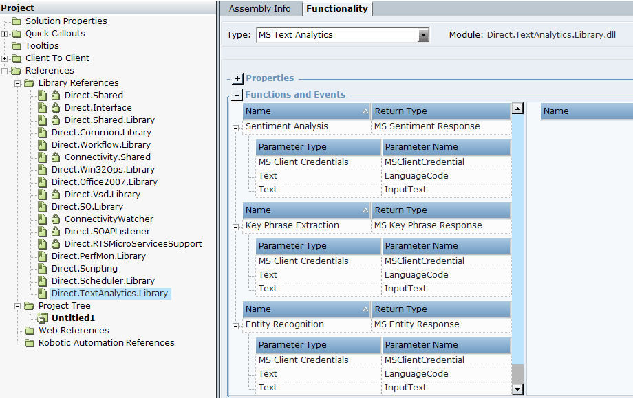 The functions and events are exposed under Project > References > Library References > Direct.TextAnalytics.Library > MS Text Analytics.