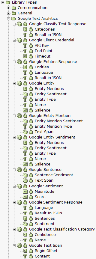 The Business Entities of the Google Text Analytics are exposed under Business Entities > Library Types > Google Text Analytics.