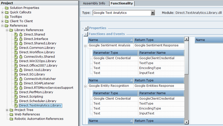 The functions and events are exposed under Project > References > Library References > Direct.TextAnalytics.Library > Google Text Analytics.
