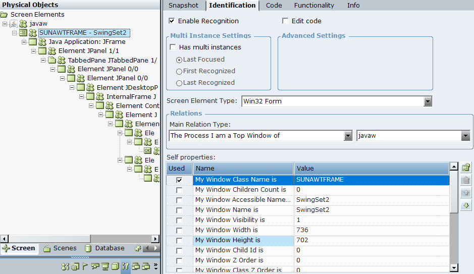 The following identification details are available for Win32 Form screen elements that represent the top-most Java window in the in the Identification tab. For more information on working with the options in this tab, see Using the Identification Tab.