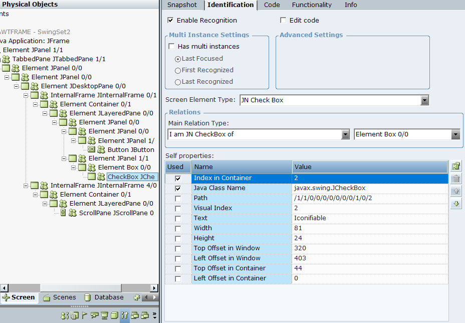You can select any Java Native screen element in the Screen Elements tree to display its identification details in the Identification tab.