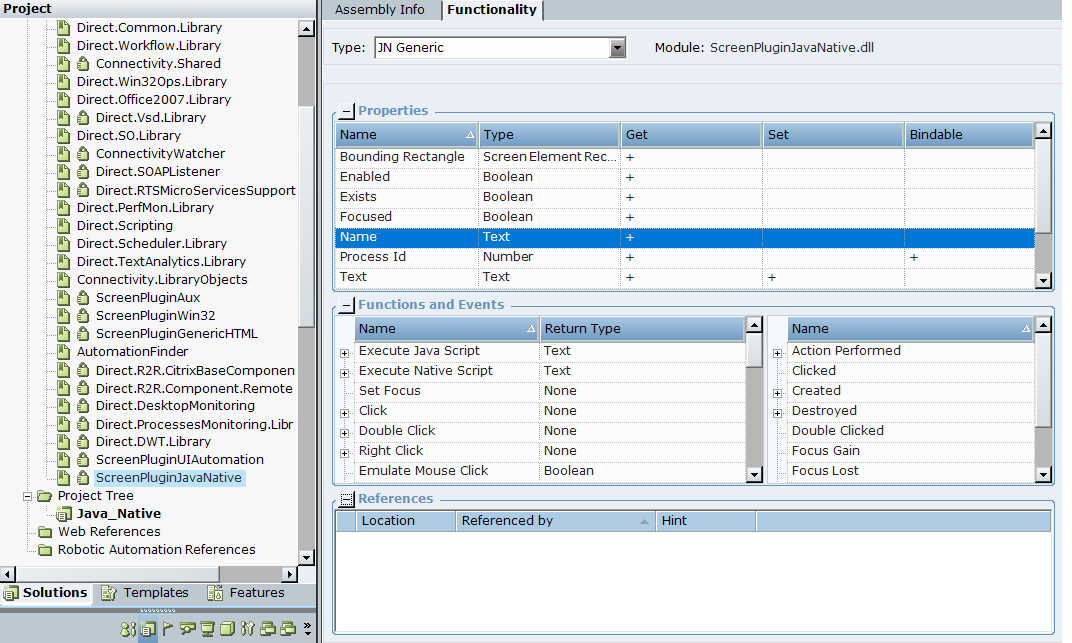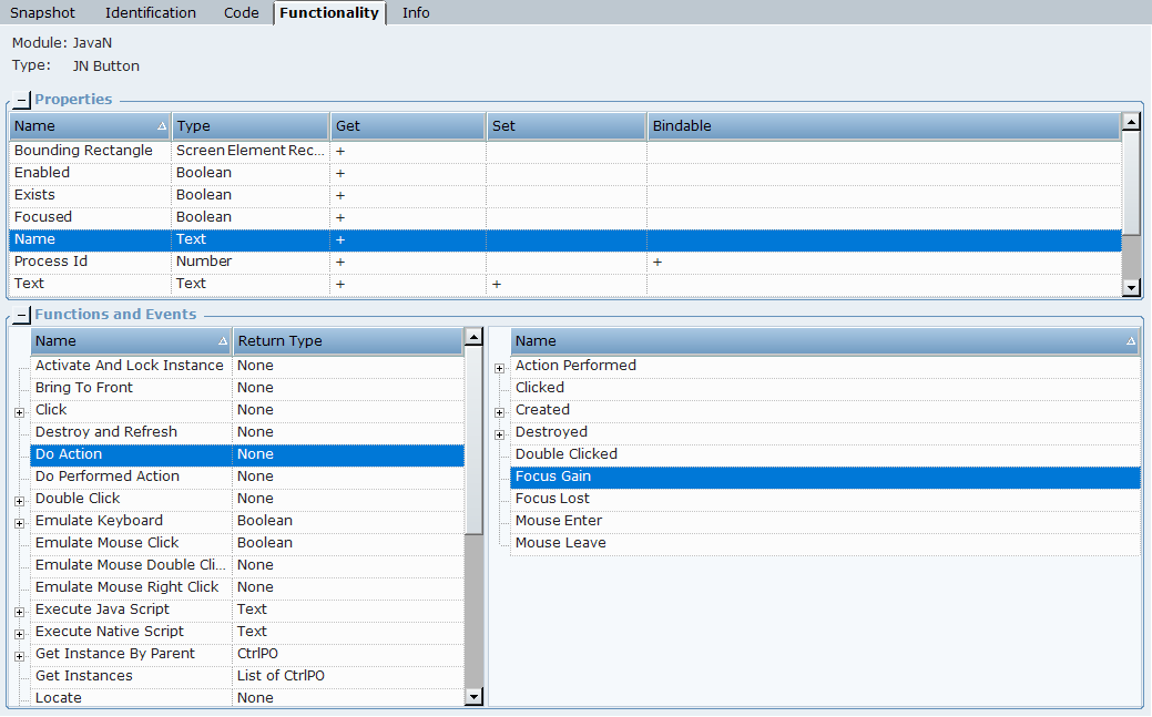 When you select a Java Native screen element in the Screen Elements tree, you can view its functionality in the Functionality tab.