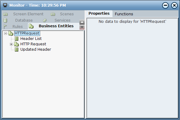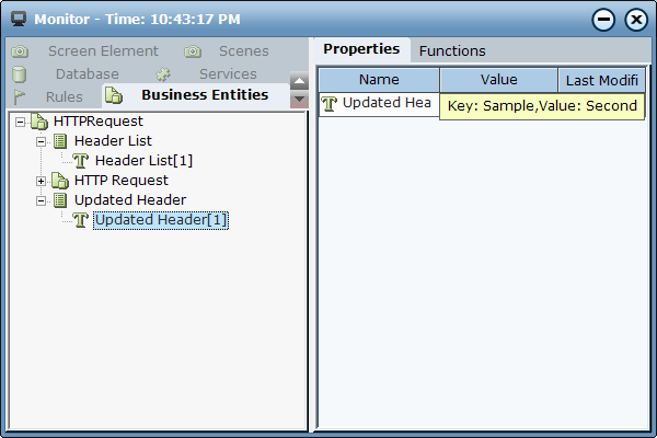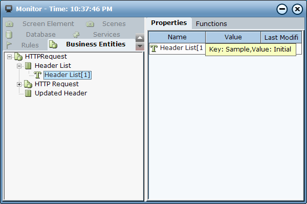 7. Select Business Entities. In the Properties tab you will see two lists: Header List and Updated Header, both of which are empty. These lists are both receive the return value of the Retrieve All Headers and Header Values function. This function writes to the Header List list when you click Retrieve Headers in the callout, and to the Updated Header list when you click Update Header Value in the callout.