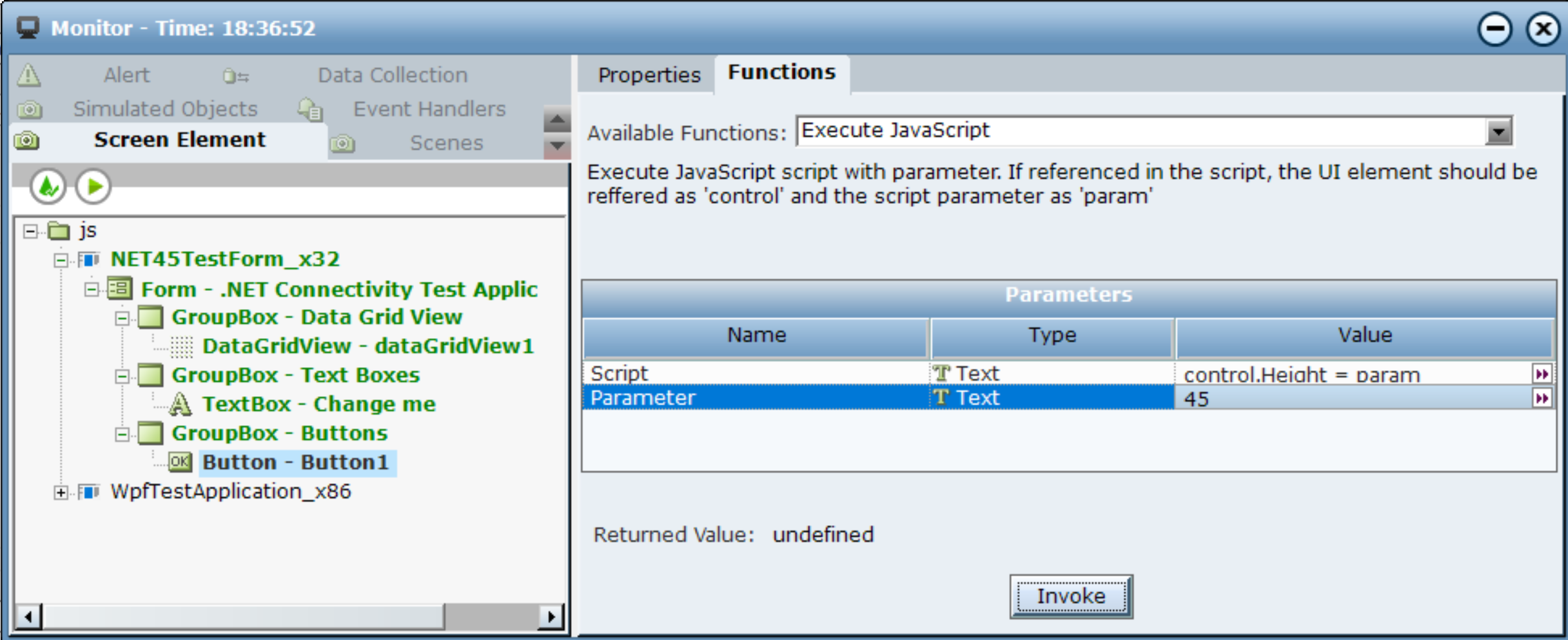 12. To test JavaScript manually against a screen element, select the Screen Element tab, select the required screen element and then click the Functions tab, and select Execute JavaScript from the list of Available Functions. Enter the Script and Parameter (optional) and then click Invoke.