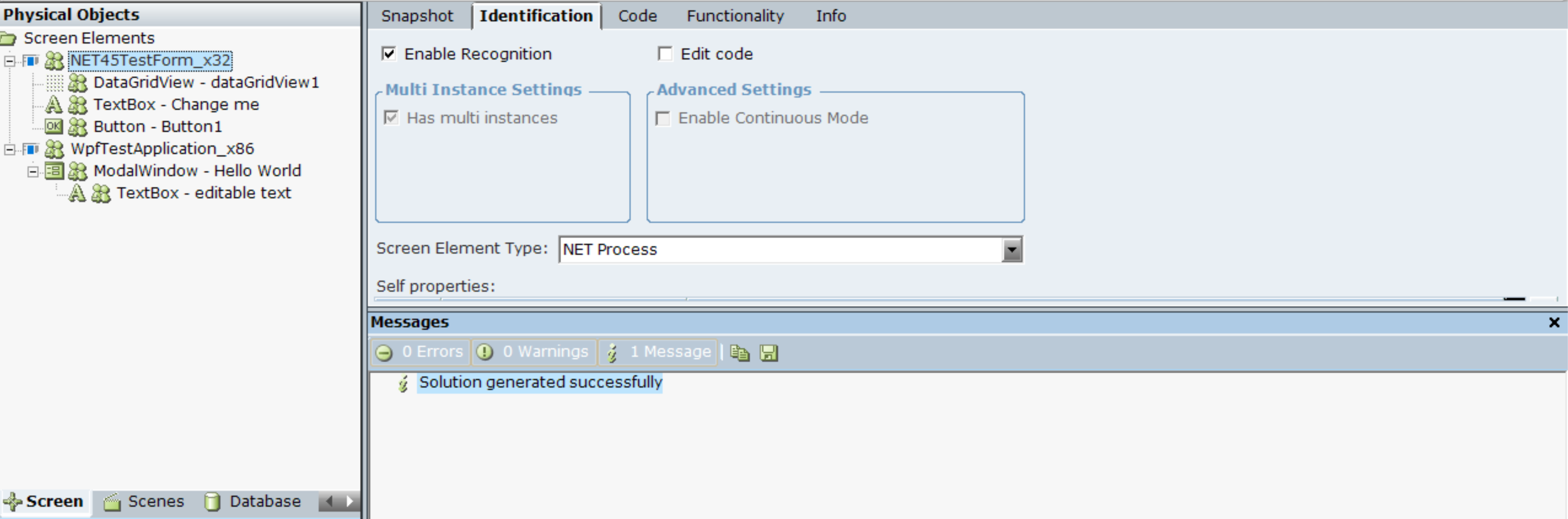 2. In the Physical Objects tab, the sample project includes a NET45TestForm_x32 screen element of type NET Process) and a WpfTestApplication_x86 screen element of type WPF Process.
