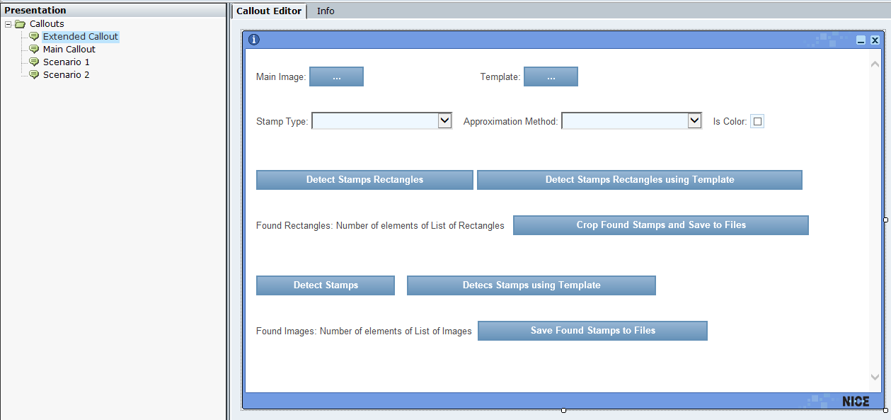 Go to Presentation > Callout. The sample includes several callouts to detect stamp rectangles and stamps in a document (with and without using a template image). |