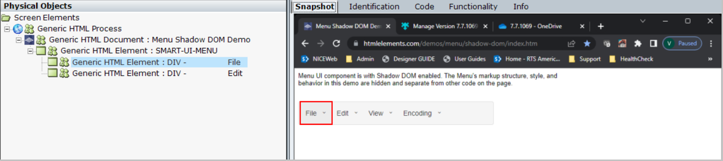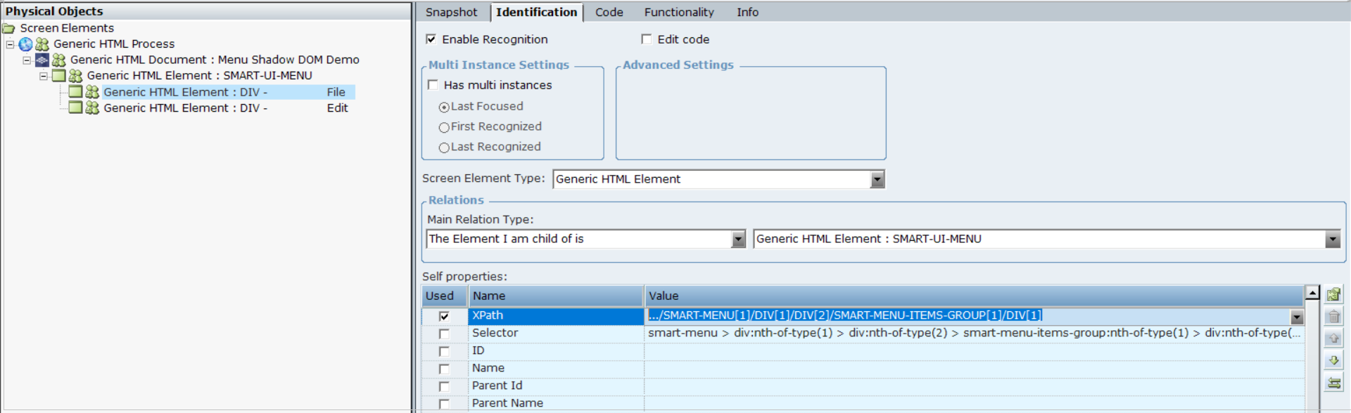 The target elements can be recognized by XPath or Selector. The shadow DOM element includes …/ at the start of the XPath value.