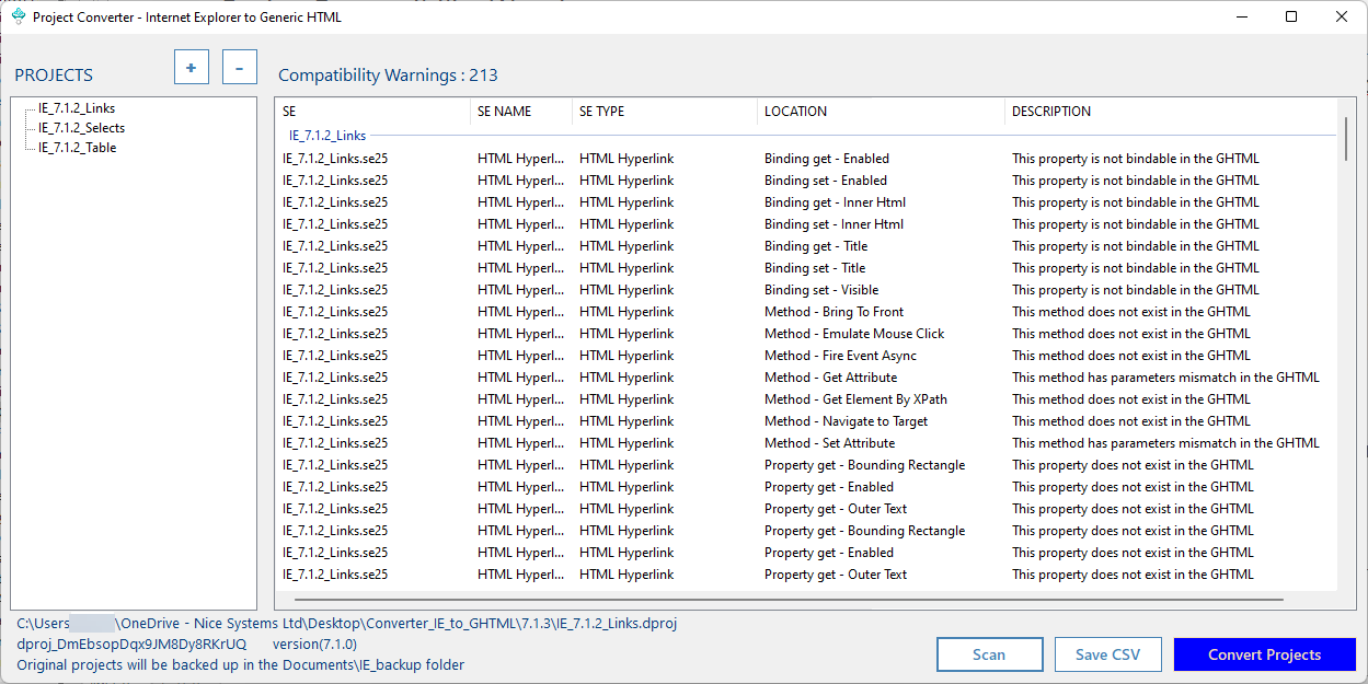 If an incompatible IE screen element is found, you are required to manually make the necessary changes to your project before or after the conversion. Before converting the project, you can save a copy of the compatibility warnings by clicking Save CSV. We recommend making the necessary changes before the conversion.