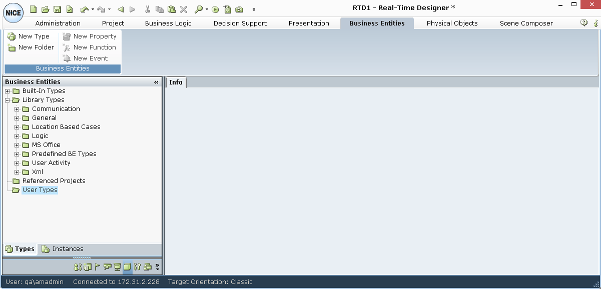 To assist you in defining business entities, Real-Time Designer is delivered with predefined business entities listed under Library Types in the Business Entities pane. Use these predefined business entities to define your business entities. See Library Types - Predefined Business Entity Types.