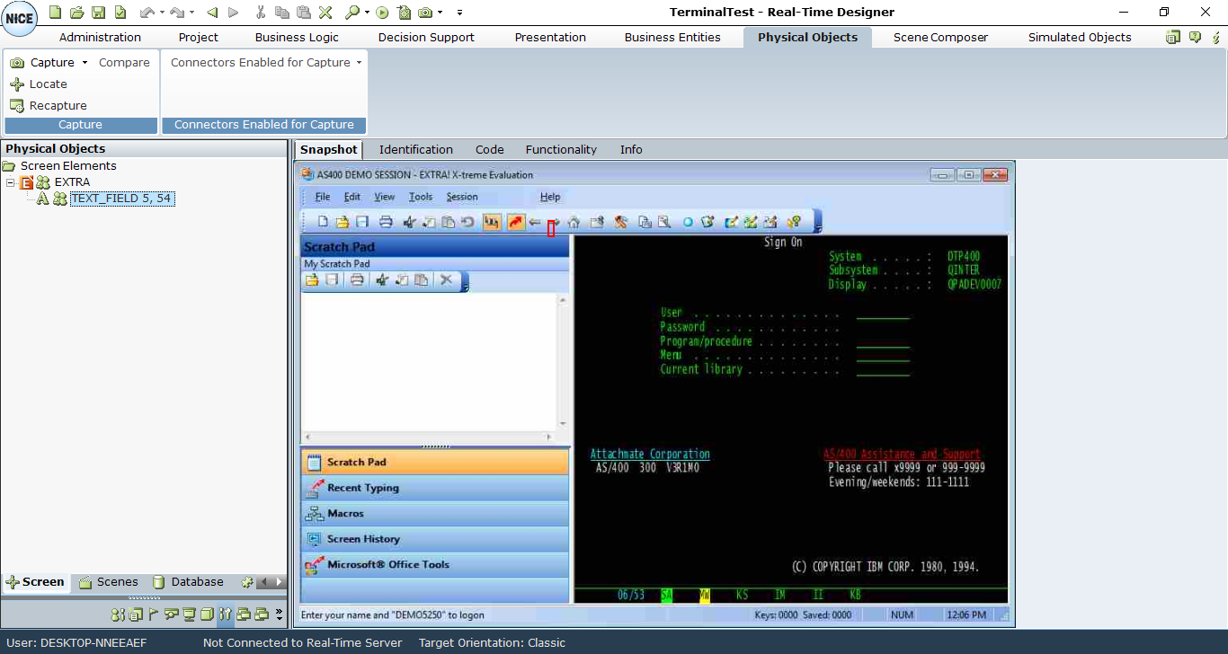 3. In the Real-Time Designer, select the Physical Objects tab. The Screen Elements tree includes two levels of screen elements - the process at root level, and the HLLAPI screen element that was captured.