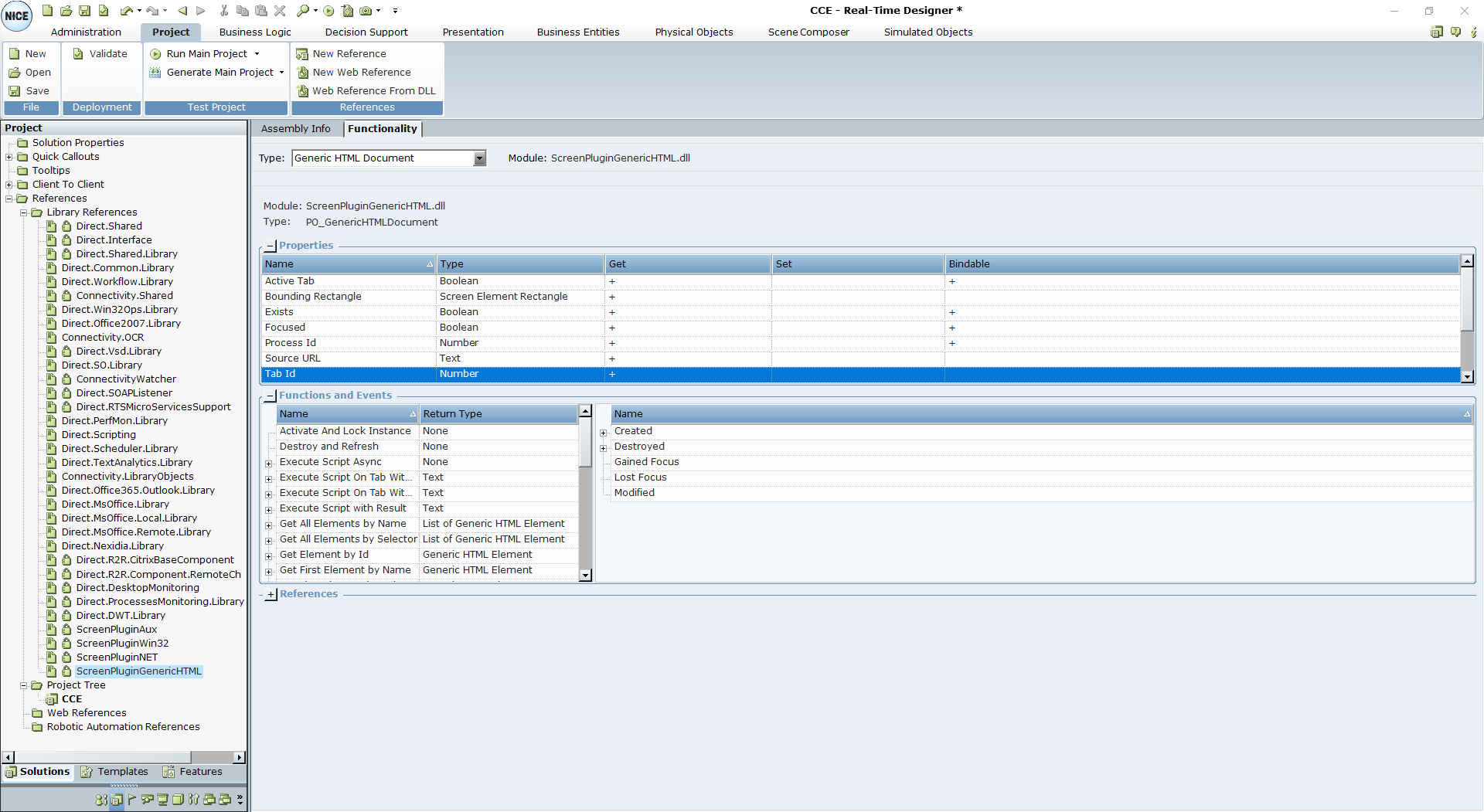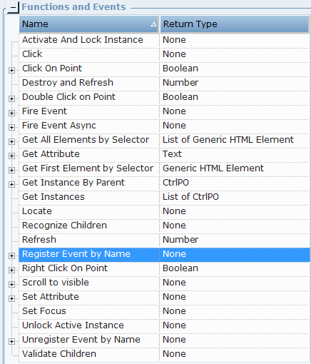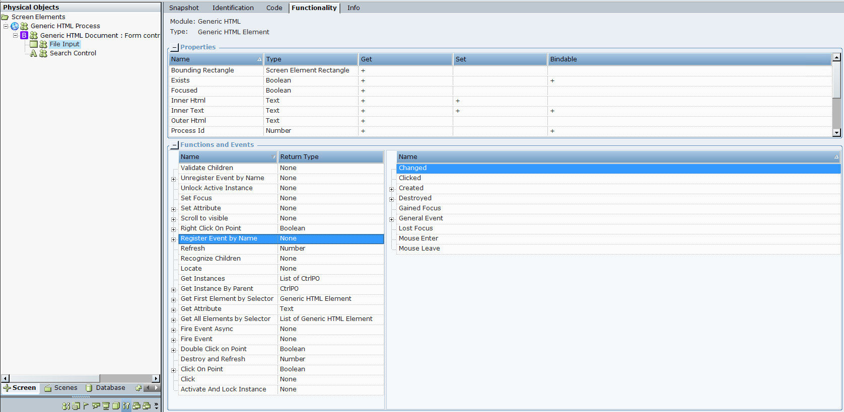 1. | In the Screen Elements tree, select the captured screen element and click the Functionality tab. This tab shows the available properties, functions, and events according to the type of the screen element. |