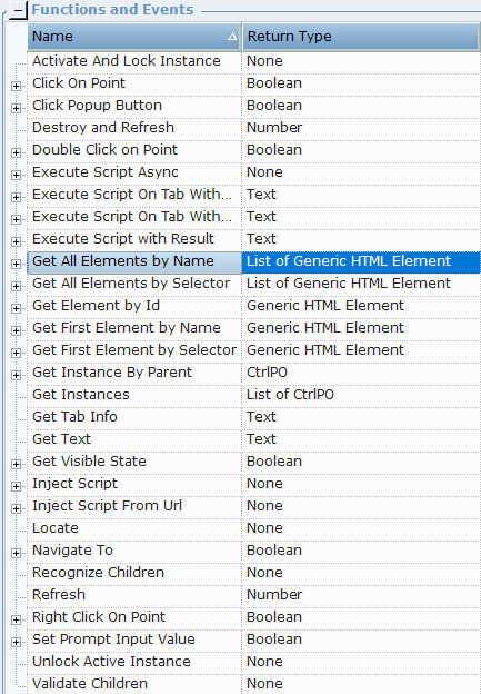 Get Instances: Returns the instances of all recognized physical objects (these can be a few if multiple instances are used. For example, a few tabs that are opened with the same web sites). You can use this function with every screen element except the Generic HTML Process. The returned type is a List of IPhysicalObject.