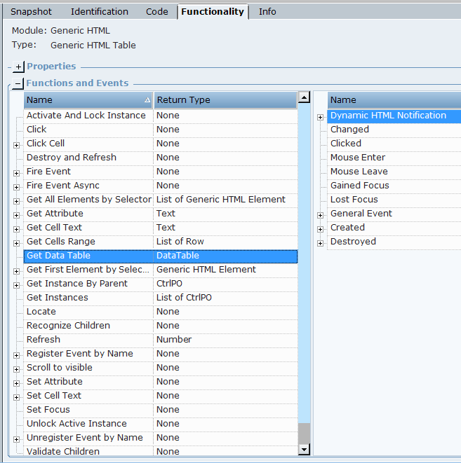 After capturing a Generic HTML screen element, you can review the available properties, functions, and events.