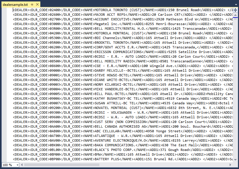 <DEALER><DLR_CODE>02400</DLR_CODE><NAME>MOTOROLA TORONTO (CUST)</NAME><ADD1>150 Brunel Road</ADD1><ADD2> </ADD2><ADD3> </ADD3><CITY>Mississauga</CITY><PROVINCE>ON</PROVINCE><POSTAL>L4Z1T5</POSTAL><PHONE>4165551212</PHONE><FAX>0 </FAX></DEALER>