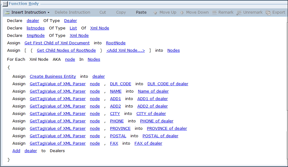 You need to add a function that, after the required declarations, assigns the first child of the Xml document into the Xml node and assigns the child nodes of the RootNode into Nodes. It then creates the dealer business entity and populates it by using the GetTagValue function to extract the required information for each of the required nodes.