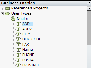 1. In the Business Entities tab, in the Types tab, under User Types, add a Dealer type with the following text properties, ADD1, ADD2, CITY, DLR_CODE, FAX, Name, PHONE, POSTAL and PROPERTIES.