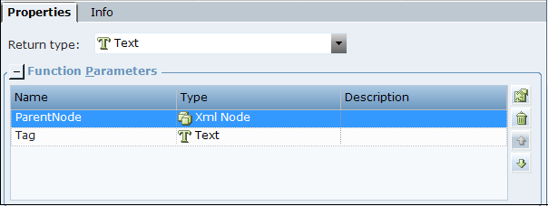 2. Add two parameters: ParentNode with Type set to Xml Node, and Tag with Type set to Text.