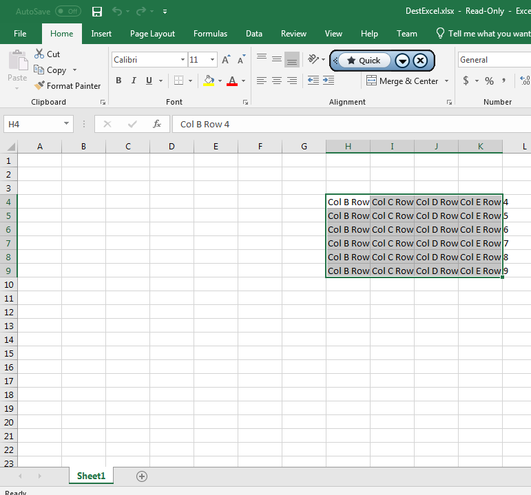 7. Open DestExcel.xlsx to view the destination Excel file. This is the data is pasted into the destination.
