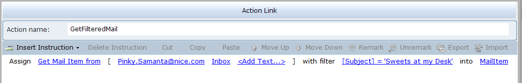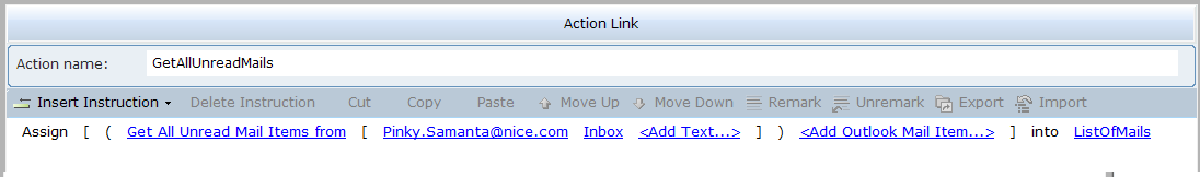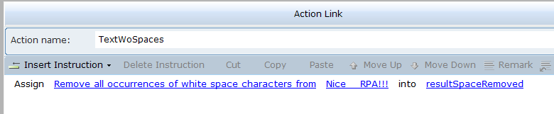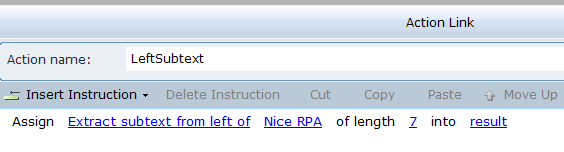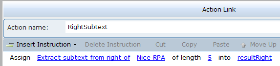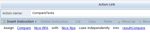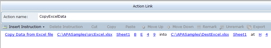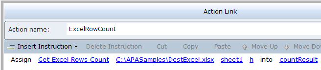 4. Select an action link, and then click on Insert an Action to view the functions. CopyExcelData copies the data from the source Excel to the destination Excel. ExcelRowCount counts the number of rows in the destination Excel.