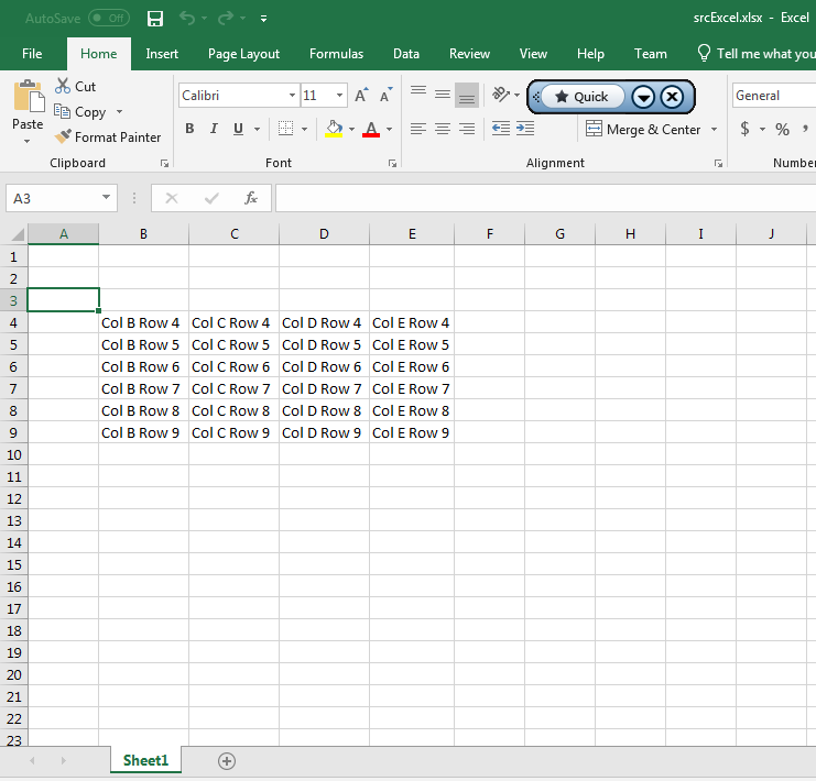 5. Open srcExcel.xlsx to view the source Excel file. This is the data that will be copied.