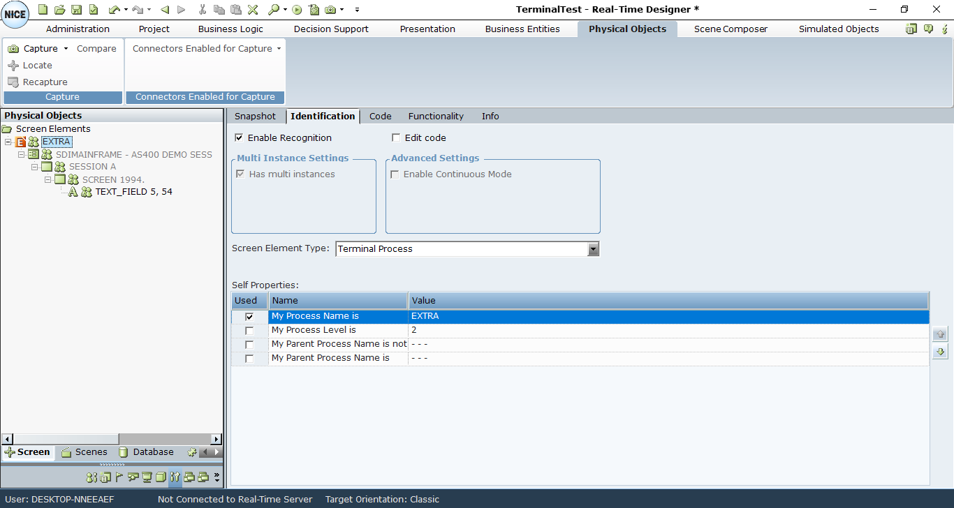 In the Screen Elements tree, you can select each level of a captured screen element’s hierarchy to display the details automatically detected by the Real-Time Designer in the Identification tab.