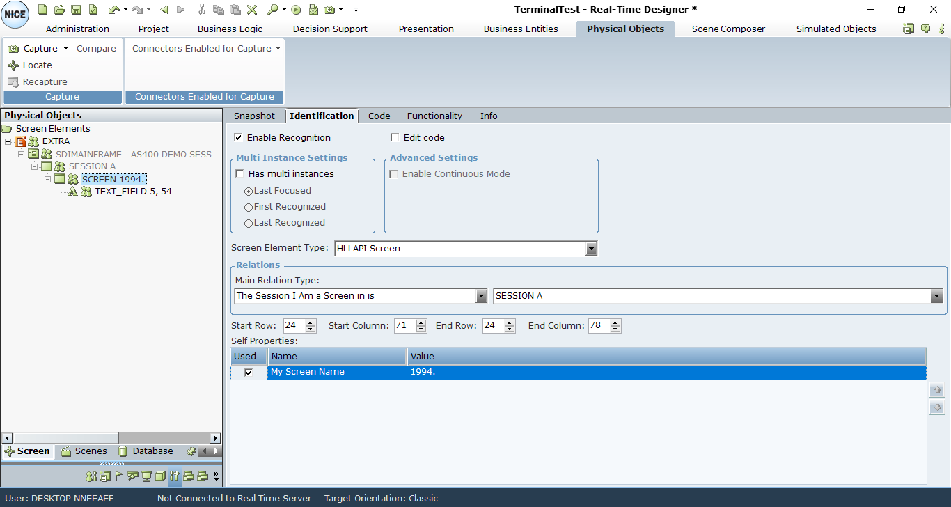 | 1. | In the Screen Elements tree, select the HLLAPI Screen screen element, and click the Identification tab. |