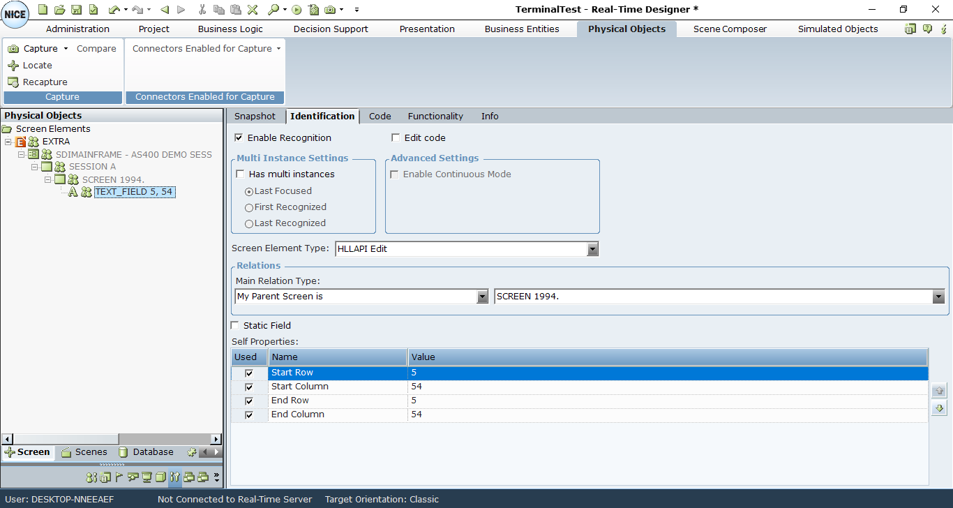 | 3. | The Main Relation Type drop-down list includes only the My Parent Screen is option and shows the parent object of the captured HLLAPI Edit control. |