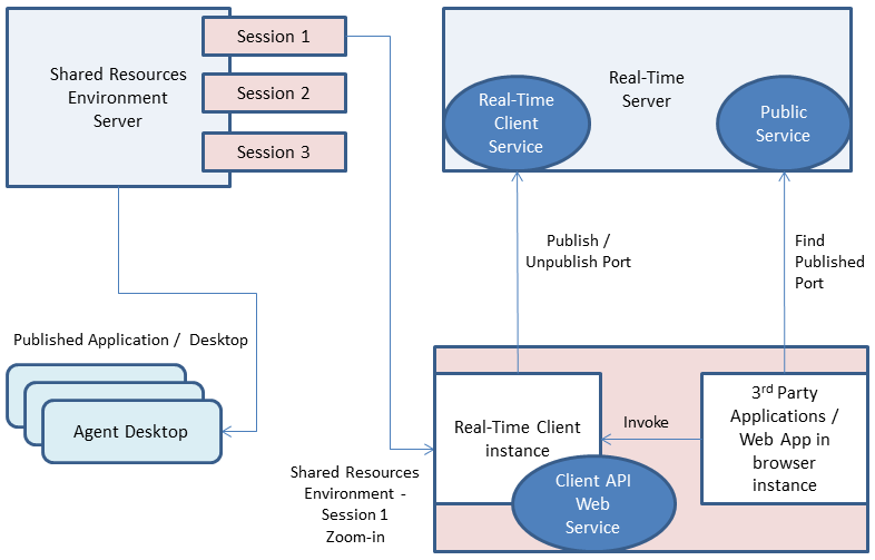 Every Agent who connects to the Shared Resources Environment receives a session. Each session should contain an instance of the Real-Time Client, and an instance of the third-party application, which invokes the Real-Time Client.