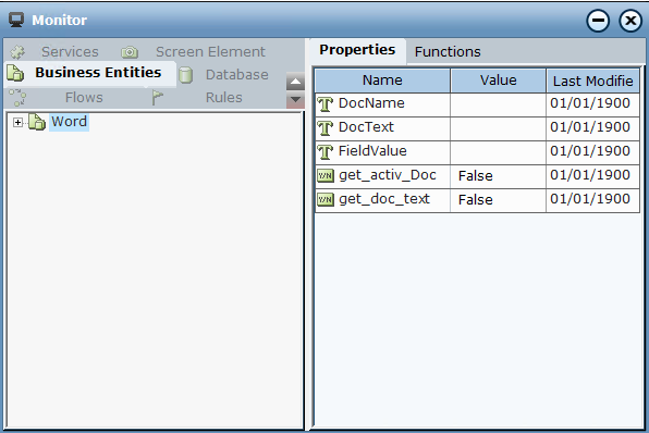 The Microsoft Word Form capability features a single function, DocName, which enables you to obtain all of the data from the document, such as texts, Boolean checkbox selections (yes/no), drop-down lists and more. Real-Time Designer obtains all of this data using the Microsoft Word Form capability, and then enables to view (read) the data using the Monitor feature.