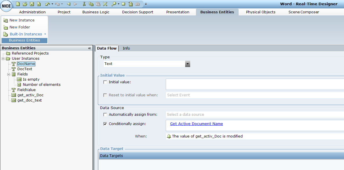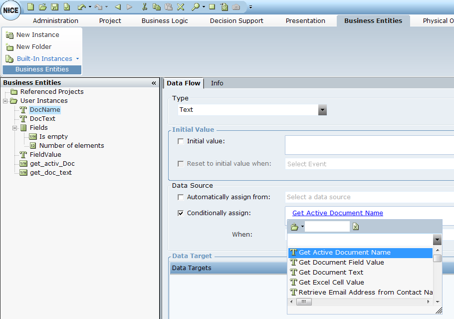 3. | Under User Instances, select DocName and in the Data Flow tab, select the Conditionally assign checkbox. |