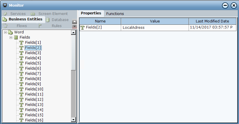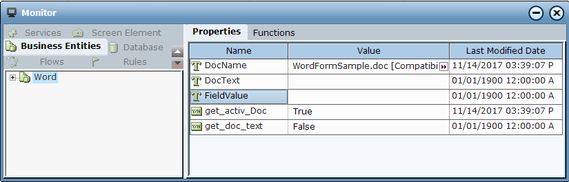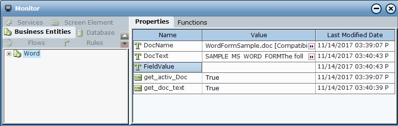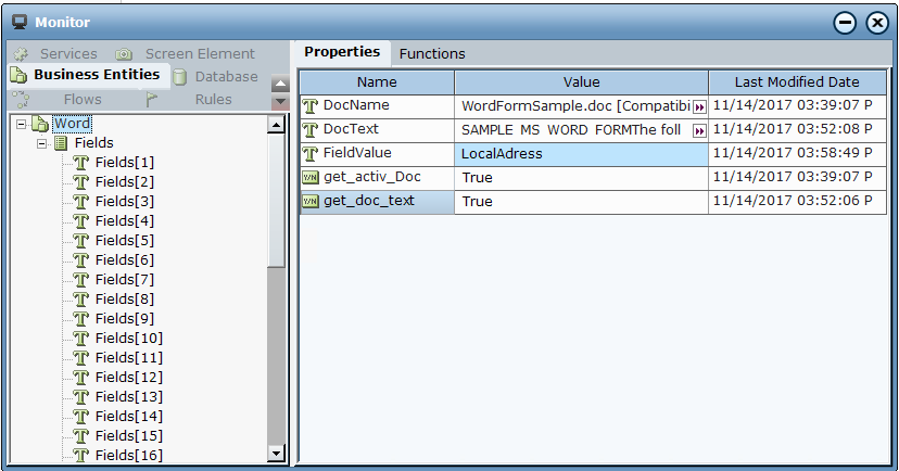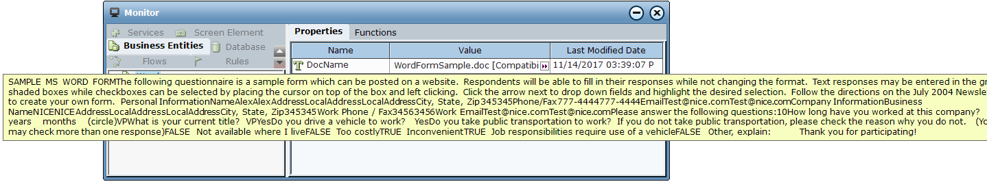 The data from the Word form document is loaded and can now be viewed in runtime using the Monitor.