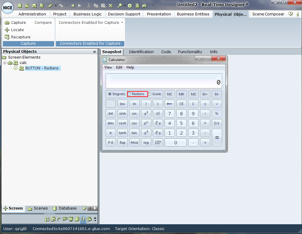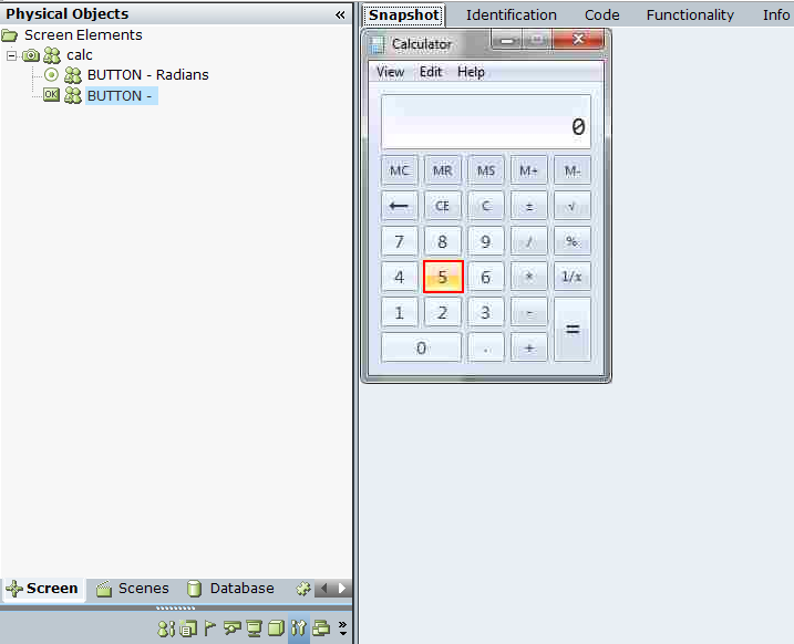 In the example above, the Radians Radio Button was captured in the Windows scientific calculator window. In the example below, Button 5 was captured in this same application in Standard view, using the right-click option instead of the left one. As a result, the images in the Snapshot tab are different for the same application.