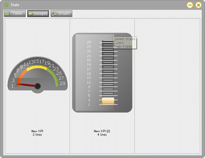 Real-Time Designer provides a set of gauges in a KPI (also called stats) dashboard that can remain displayed on an agent’s or supervisor’s desktop. This enables them to keep track of how much progress they are making towards attaining the company's goals. An example of a KPI dashboard is shown below: