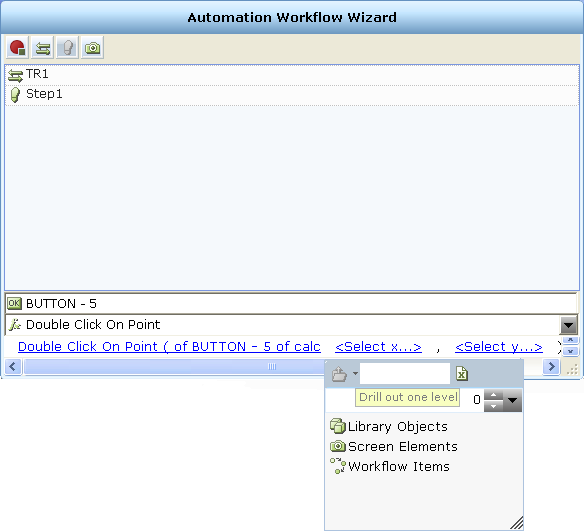 4. | Define the action for the step. To do so, click the down arrow in the drop-down list below the edit box, and then select the function or property to assign to the screen element. This drop-down lists all the functions that are relevant to the screen element as well as the properties whose values you can change (assign). For example, in the window below, the Double click Point function is selected for the Button - 5 screen element. |