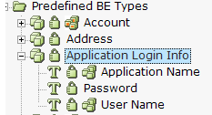 In the Business Entities tab, open Library Types > Predefined BE Types > Application Login Info. The following login credential types are available: